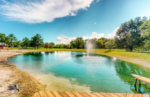 Offering the best of both worlds, this retreat features an adorable cedar cabin and luxe resort-style amenities. Enjoy a beautiful pond, a white sandy man-made beach, a sunning/swimming deck, and a custom-built palapa hut with a 12-foot bar, mini fridge, and hot/cold water. There’s also a firepit and a convenient two-stall outdoor bathroom.