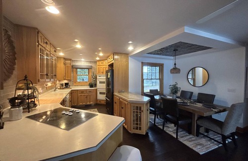A gourmet chef's dream is complete with our fully functional kitchen featuring expansive cabinets, a double oven, glass stove top, and spacious double door refrigerator. Adjacent to the kitchen is a dining room area with a unique, custom made, tin ceiling accent. Across from the gourmet kitchen is the living room, featuring a sensational view. Imagine waking up and drinking a cup of coffee or tea while watching the sunrise or snuggled up by the fire place, sipping a cup of hot cocoa while snowflakes swirl and dance their way to the ground. Just through the door in the living room, on our spacious deck is a hot tub and gathering area perfect for entertaining and taking a relaxing dip after a fun-filled day on the water. While staying at our retreat, you will have accessibility to kayaks, a paddle boat, and our newly renovated dock to use at your leisure. East Bass Lake is EXCELLENT for panfish fishing, toss in a line off our dock and we can almost guarantee a catch with every cast.