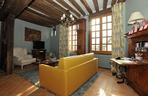 In the historic safeguarded district of Chartres, on the first floor of a half-timbered character house, 500 meters from the cathedral, an apartment full of charm with beams and tomettes decorated with a priest's garden.