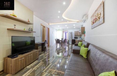 This designer APT, has a large living area with a super comfy sofa and TV and a dining area where anyone can just relax and enjoy their holidays.