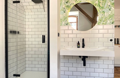 Living in a Wilhelminian-style house: unique, cozy & a little nicer! The modern loft apartment is located in a beautiful Wilhelminian-style building in the Hof city center. The pedestrian zone and train station are both just a few minutes' walk away. The loft has a kitchenette, a queen-size bed, an en-suite bathroom with a freestanding bathtub and a walk-in shower. The ceiling spotlights can be coloured to create an individually cosy ambience for bathing. The kitchenette has a microwave, a kettle, a fridge, a small freezer compartment and enough crockery, but no stove. There are also champagne glasses for romantic evenings. The light from the ceiling spotlights in the open bathroom area can be adjusted using a remote control, so that guests can create their own cozy ambience for a long bath. The toilet is separate from the bathroom area and can be locked. The shower is modern and floor-level. For longer stays, we are happy to provide a separate induction hob and matching pan and pot upon request. The electricity for the apartment comes 100% from sustainable sources. Coming from the train station, the apartment is a maximum of 10 minutes' walk away. There, you can check in independently using the key safe. One of the two keys allows you to access the historic staircase, and the other key opens the apartment. The apartment is on the 3rd floor. 1st floor of the Wilhelminian-style building. Due to monument protection regulations, there is unfortunately no elevator. Guests arriving by car can park for free on the street in front of the house. However, you should be careful as there are some places on the street where parking is strictly prohibited. The apartment is located in a beautiful district with many Wilhelminian-style houses and little traffic in most places. The train station and pedestrian zone are both just a few minutes' walk away. In just 2-3 minutes you can reach the first bars and one of Hof's most popular pubs, the "Treffpunkt", where you can get delicious burgers and local beer.