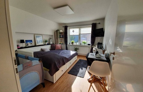 Nice room with directly adjacent large private shower room. Bed can be used as a single or double bed. Windows into the green, privacy guaranteed. Optional use of kitchen. TV and WiFi incl. 3 minutes from the A7 in a quiet courtyard. Modern furnishings and always guaranteed clean and tidy. Own entrance with own corridor incl. Cloakroom, umbrella stands and umbrellas.