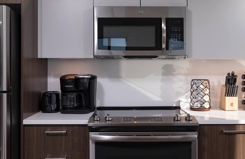 The gourmet Kitchen is fully equipped with everything you need including dishes, glasses, cutlery and pots and pans. The kitchen features Shaker-style birch cabinets and tile floors, granite counter tops and full-size Energy Star GE s stainless steel appliances (four burner stove, oven, microwave, dishwasher and side-by-side full-size refrigerator with ice maker), toaster, and coffee maker. Coffee, tea and sweeteners are provided. Parking is available at either --same building underground or in a near by parking lot. Please budget for parking and contact us if you need to reserve one.