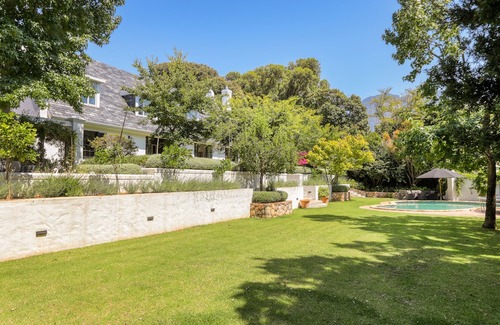 Private electricity back up. Enjoy a stylish experience at this centrally-located home in Bishopscourt. This 3 bedroom home has a separate stunning 2 bedroom, 2 bathroom cottage that can be booked as well. Price on request. The terraced gardens with manicured lawns have a stunning pool area with outside seating and pool loungers. The open flow kitchen , dining and lounge areas all open out the gardens. A beautiful formal lounge/library area with wood fireplace. House is serviced 5/7 days.