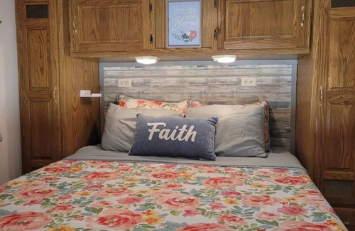 We strive to offer a safe, clean, peaceful RV stay at a reasonable cost. This is a smaller space, but it was renovated to contain all the homey touches a guest may need. The bedroom contains a queen size bed with a brand-new memory foam mattress and pad. The kitchen is fully stocked with all the basic necessities. There are two smart TVs for guest use ; one in the bedroom and one in the living room area. The second bed is a full-size pullout couch with a mattress pad provided for extra comfort. We do provide a small grab and go breakfast bar for guest convenience.