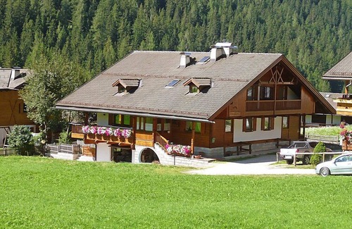 Penia 3 km from Canazei: Child friendly, comfortable chalet "Cesa Galadriel", 1'555 m a.s.l., 2 storeys. 3 apartments in the property. In the hamlet Penia, 1.5 km from the centre of Alba, 3.5 km from the centre of Canazei, in a quiet position, 1 km from the skiing area, south-west facing position. In the house: central heating system, heating available only from 01.Dec. - 01.May.. Parking (limited number of spaces) on the premises, public parking 500 m on the road. Shop 300 m, grocery 100 m, restaurant, bus stop 100 m. Mountain railway 1 km. Please note: car recommended. In case of good snow conditions, the house is accessible on skis.