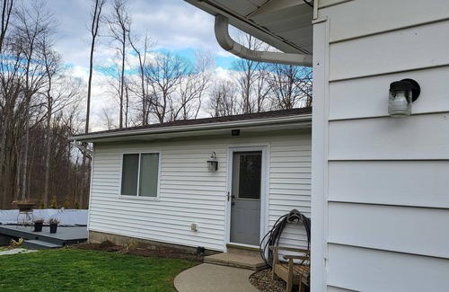 Private in-law-suite on 2 acre wooded setting in Bainbridge Twp. just 10 minutes from historic Chagrin Falls and easy access to freeway to easily go downtown Cleveland or explore the Cuyahoga Valley National Park. Suite has full kitchen, 1 bedroom, large bathroom with walk in shower, shared patio/deck area with pool (by request) and fire pit. Main home is occupied by hosts and connected via shared laundry room (available for 3+ day stays) with double locking doors. Suite has private entrance and covered parking.