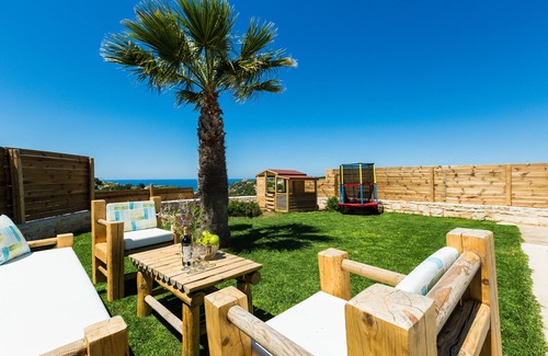 Nestled in the serene village of Prinos, Chainteris Villa II presents an ideal retreat, offering a perfect blend of comfort and natural beauty. Surrounded by a lush landscape of olive groves and captivating views of the Cretan Sea, this thoughtfully designed single-story villa ensures an exceptional stay. Each room provides direct access to a private garden and pool, enhancing your experience of peace and relaxation. Discover the ultimate in tranquil luxury at Chainteris Villa ΙI, where every detail is crafted for your utmost enjoyment. The villa boasts a stunning outdoor area featuring a 20m² private swimming pool (1,40m depth, non-heated), a shaded dining space with charcoal BBQ facilities, and a sun-kissed lounging area, perfect for relaxation and outdoor dining. For young guests, a delightful playground featuring a trampoline, playhouse, and a variety of outdoor toys brings an extra touch of charm and enjoyment to this peaceful retreat. Inside, traditional wooden accents seamlessly blend with modern amenities, creating a warm and inviting atmosphere that exudes comfort and style. Conveniently located just 10 minutes by car from sandy beaches, charming tavernas, and the vibrant town of Rethymno, the villa provides the perfect balance of seclusion and easy access to Crete's rich attractions.