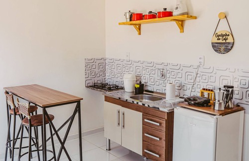 The kitchen is equipped with a stovetop, as well as a coffee maker, cookware, and a toaster. Bathroom amenities include a hair dryer and towels. Other amenities include bed sheets, an ironing board, and limited housekeeping.
