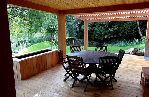 The 38 m² terrace is equipped with a gas barbecue and a lunch area with teak furniture, overlooking Lake Pannecière.