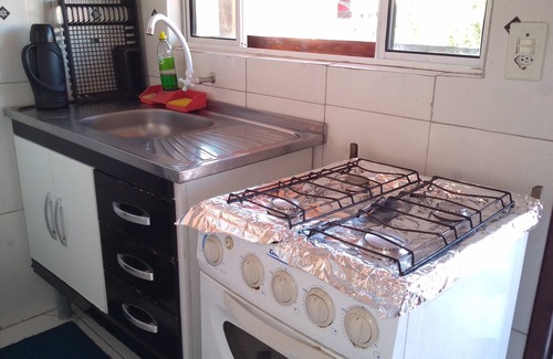 Combined living room and kitchen, with stove, refrigerator, table-counter with stools, cabinets, sink with cabinet, household utensils (plates, glasses, cutlery, pots, pressure cookers etc ...), microwave oven, blender and double sofa bed / single, bedroom with 01 double bed and 02 bunk beds, with bed linen and pillows (sheets, sheets and pillowcases, no change), TV. LED 32 "Full HD, wall fan, puff and multi-use cabinet, large bathroom, 01 parking space, plus an exclusive area with barbecue, sink, tank, table with 06 chairs and 02 hammocks.