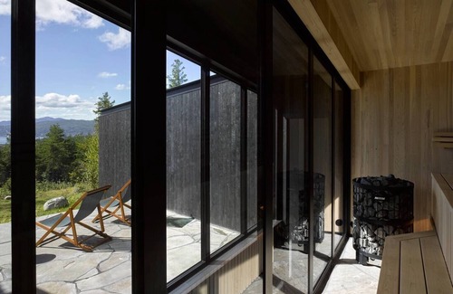 Inside, every detail has been meticulously crafted. The flooring is made of natural stone, and the staircases are carefully worked. The spaces are adorned with black and white painted wooden panels, while the bathrooms, entirely clad in natural wood, offer a refreshing atmosphere reminiscent of spas. Connecting the two wings of the house, a sauna opens onto a panoramic view of the Saint Lawrence River and the mountains.