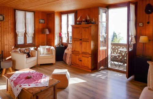 "Chalet Tsi-No", 5-room chalet 105 m2 on 3 levels. Practical and comfortable furnishings: lounge with open-hearth fireplace and TV (flat screen), radio and DVD. Exit to the balcony, south facing position. Office. 1 room with 2 pull-out beds (2 pers. 2 x 90 cm). 1 room with 1 french bed (1 x 140 cm). Shower/WC. On the lower ground floor: large kitchen (oven, dishwasher, 4 ceramic glass hob hotplates, microwave, electric coffee machine, Capsules for coffee machine (Nespresso) extra, raclette grill, fondue Set (cheese)) with bar, dining table. Sep. WC. Upper floor: (steep stair), 1 room with sloping ceilings, ceiling height 120 - 140 cm, without wardrobe with 1 french bed (1 x 160 cm). Small balcony, south facing position, small garden, west facing position. Terrace furniture, barbecue. Very beautiful panoramic view of the mountains. Facilities: washing machine, dryer. Internet (WiFi, free). Reserved parking (2 cars). Please note: non-smoking house. 1 pet/ dog allowed.