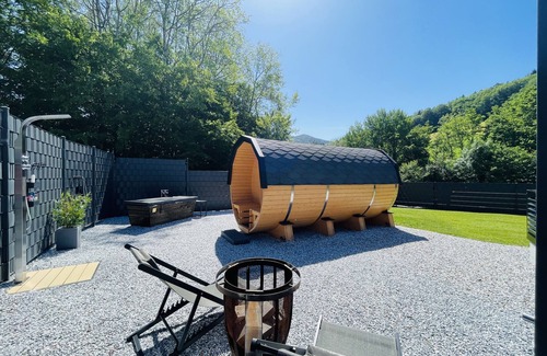 The highlight of this accommodation is its private outdoor area with a a garden, a covered terrace. An outdoor XL Double Bathtub & Shower is available both in summer and in winter. Take a refreshing bath on warm summer days or watch the dance of the snowflakes from the comfortably warm water. If you like, you can also refine the bath water with aromatic bath additives. In addition, we would like to point out that the bathtub is always filled with fresh water, which is a great advantage compared to various whirlpools or pools, as no chemicals, used water etc. are consumed. We can therefore guarantee the best hygiene standards. In addition, a private sauna cabin is available for your use in the outdoor area.