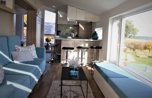 Panorama Cottage 4 is a modern and ecological chalet that stands out because of its large windows. The detached chalet is on the ground floor and suitable for 4 persons. In the tastefully decorated living room you will find a sitting area with television and a modern kitchen with spacious cooking island, bar stools, dishwasher and filter coffee machine. The chalet has 2 bedrooms, 1 with a double bed and 1 with 2 single beds. The bathroom has a toilet, sink and shower. Outside the chalet you will find garden furniture on both sides and a partially covered terrace. There is parking space for 1 car at the chalet and you can connect to the Wi-Fi for free.