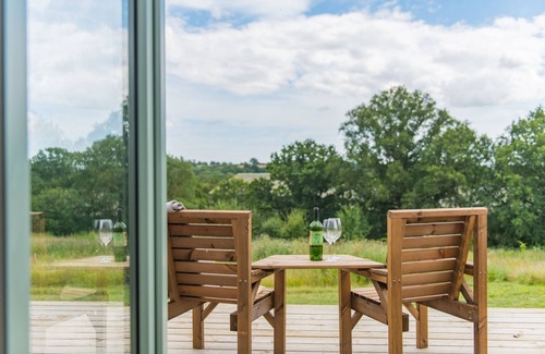 Decked terrace with private hot tub, wooden chairs with views over wild flower meadow & hop fields