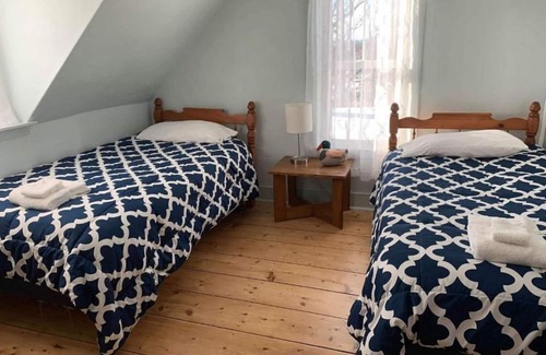 Just 9 min to Mount Sunapee Resort. The chandler and Mallard rooms consist of 2 of 12 rooms in the historic Brook Road Inn, which are rented out together as 1 unit. The rooms are rustic, in the building's historic style. The chandler room offers a queen bed and the mallard room has two twin beds and a private bath in the hallway. The doors lock from the inside and outside for privacy and safety. Rooms are located up a narrow staircase and share a hall with 8 other guest rooms. The bathroom is private and located in the hallway next to the 2 rooms that are always rented out together. This is a non-smoking property. This room has limited power outlets.