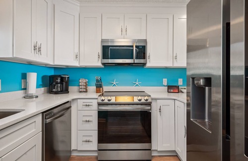 As you walk into the condo, the kitchen area is on the left and finished with stainless steel appliances and bright, white cabinets with cleat pulls.