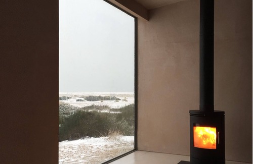 Open plan living with cosy wood burner and sliding full height window leading outside: