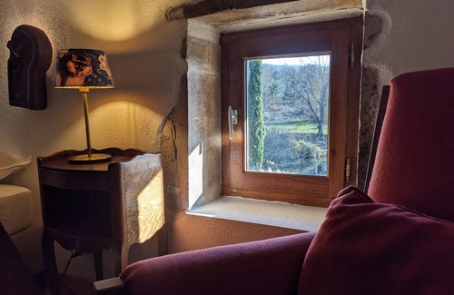 Entering Le Petit Chaudenas, guests are greeted by a beautiful and spacious modern kitchen set amongst oak beams and stone walls. Off to the right, a large living room features a Sofa bed, a Dining Table for 6 as well as log burner and reading corner. Patio Doors lead back out on to the gardens with views over the pond and woodland beyond. An ancient bread oven set in the far wall is a reminder of the building's past life.