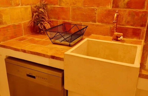 The kitchen is very characteristic and fitted with a traditional concrete sink, decorative copper items, and antique table and chairs, yet it has modern Smeg appliances including a dishwasher and Lavazza coffee machine.