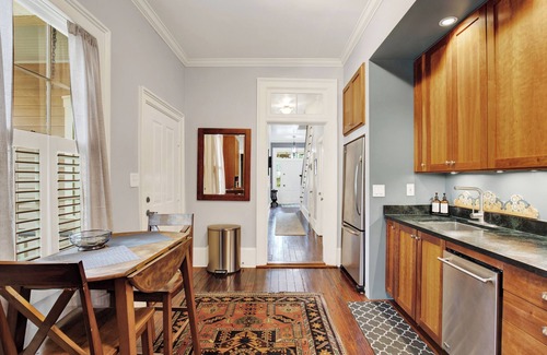 The galley-style kitchen has space enough for cooking plus a clever breakfast nook for sharing morning muffins or a midday snack. A gas range, microwave, dishwasher and built-in refrigerator provide the tools you'll need for gourmet creations. All our Savannah vacation homes are fully stocked with dishes, glassware, cookware and flatware for your use throughout your stay.