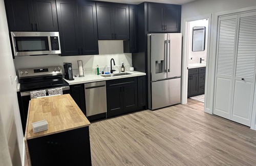 Perched privately above the main garage with its own entrance, this peaceful guest suite features a luxurious king-size bed, a spacious bathroom, and a fully stocked kitchen—perfect for everything from quick breakfasts to home-cooked dinners. Whether you're here to relax, explore, or work remotely, we’ve got you covered with AC, heating, high-speed Wi-Fi, a dedicated workspace, washer/dryer, and more.