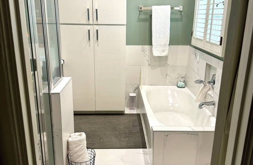 This Beverly Hills house boasts 1 inviting bedroom with King size bed and full marble bathroom with gorgeous shower and separate soaking tub. Guests can enjoy amenities like Nest AC, a washing machine, WiFi, heating, and backyard. Experience what Beverly Hills has to offer with a stay at our welcoming duplex house. Great area of Beverly Hills, walk to shops, restaurants, Rodeo Drive. No need for a car, walking distance to everything Beverly Hills has to offer. One story home/duplex, has its own private entrance. 3 closets, 65 inch Smart TV with all the apps. Kitchenette has coffee machine, microwave, fridge and electric cooktop, hot water kettle. Electric Car Charger avail upon request.