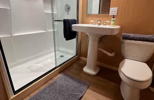 Discover this lovely 1-bedroom gem in Rumford. This phenomenal cabin offers WiFi, AC, and propane fireplace heating for your comfort. With a cozy office space featuring a full bed, this property is perfect for guests looking for a relaxing stay. Exceptionally comfortable queen master bedroom with log frame gives this in town property a cabin in the woods feel. We look forward to welcoming you to our place.