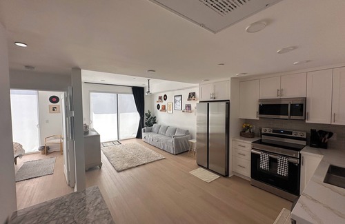 Modern 1BR in the heart of Koreatown, Los Angeles! Located in a brand-new building, this stylish unit features a smart projector for streaming, a comfy couch that pulls out into a daybed that can sleep a couple/2 small children, a spacious private patio with a dining table-perfect for relaxing or dining al fresco. Enjoy new appliances, a fully stocked kitchen, sleek design, & a free designated parking space gated within the building. Walkable access to LA’s best food, shops, and nightlife. Centrally located for quick trips to DTLA, Hollywood, & more!