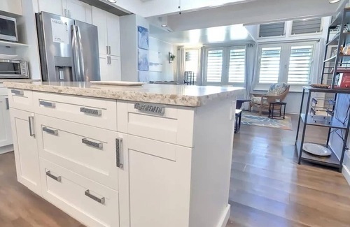 Modern kitchen with all-new cabinets, ample storage, sleek quartz countertops, new appliances, and a spacious island ideal for entertaining