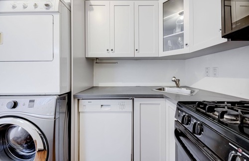The kitchen is outfitted with a refrigerator, stove, microwave, dishwasher and laundry facilities (washer and dryer). Various cooking utensils and appliances (coffee maker, toaster and kettle) are available to guests. Between the living room and kitchen is a full bathroom, including a bath tub.