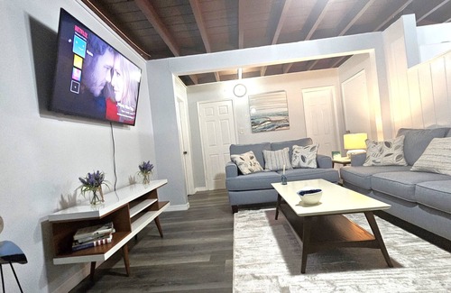 Upon entering, you'll find a bright and inviting living space, designed with comfort in mind. The open-concept layout seamlessly connects the living room, dining area, and kitchen, creating a spacious environment to unwind after a day of exploring. The cozy living room is the perfect place to relax with a book or enjoy a movie on the flat-screen TV, while the dining area offers ample seating for meals or gathering with friends and family.