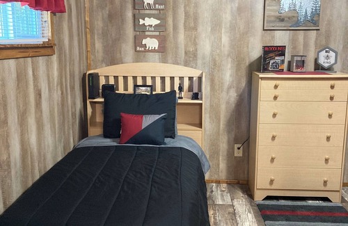 This cozy 2-bedroom retreat features 1 queen bed, 1 full bed, 1 bunk bed, and 1 twin bed, perfect for families or friends. Unwind in the living room with a comfy futon after a day of exploring. 42 inch smart tv, coffee pot, toaster, microwave, electric skillet, crock pot, dishes, silverware, grilling utensils. Outdoor propane grill, with a picnic table.