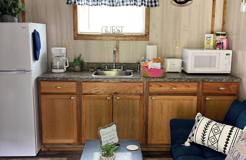 Microwave, electric skillet, crock pit, coffee pot, silverware, dishes, pots and pans and grilling utensils are all available for your use. Propane grill and picnic table for cooking out.
