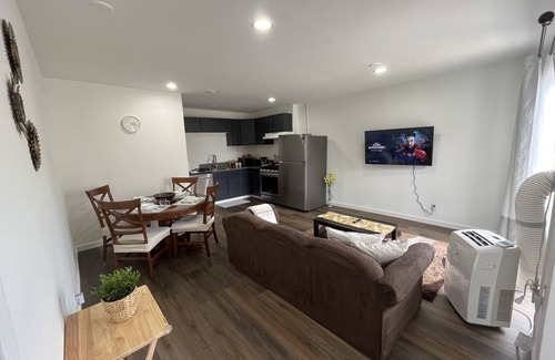 -Fully furnished living/dining room with brand new 50 inch flat-screen smart TV that you can connect to your favorite streaming service, Ductless AC for cooling and heating