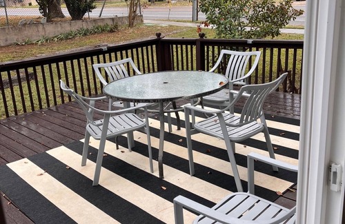 Outdoor deck with table and chairs to sit and unwind or sit on the front porch and watch the days go by.