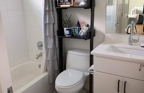 My home is an East Austin oasis, tucked back off Chicon just steps from Figure 8 Coffee, Rockstar Bagels, and the epic East 6th Street bars and restaurants. With 2 bedrooms, 2 bathrooms, and a queen-sized memory foam mattress that pulls out if the couch, this home is perfect for family or friends to share. The open kitchen and skyline views from the balcony make it a great place to share a meal or a drink before heading out on the town. The kitchen is fully stocked for family meals or longer term stays, and the space is perfect for tourists or digital nomads.