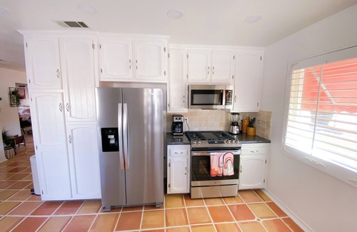 Get ready to relax in this wonderful 2-bedroom house in Yucca Valley. This cool property features 1 king bed, 1 queen bed, and 1 twin-trundle bed, perfect for a small group of guests (two roll -away beds, Pack N Play, and high chair available as well). With amenities like WiFi, AC, a washing machine, and family games, your stay will be comfortable and convenient. Your family will be close to everything when you stay at this centrally-located property. You are within walking distance from Starbucks, Vons, and Applebees, and are only a 9 minute driving distance to Joshua Tree National Park! With the airport visible from the patio, you and your family can be entertained watching private planes land and take off. This home is also dog friendly with a large and gated backyard for them to run. Fall in love with Yucca Valley and enjoy the magic it has to offer.