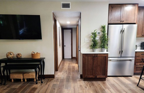 Newly Renovated! This home has close access to the 33 bi pass, and is on a scenic setting in Lancaster Ohio. We have this home set up for your next get away to Lancaster or the Hocking Hills region. The upper floor has an open floor plan with a recently upgraded kitchen, comfortable beds, a deck with table set overlooking the wooded and private back yard. There are is a staircase from lower level to reach the First Floor* 3 bedrooms are on the first floor with the master having private access to 1st floor bath. On the lower level (where you will enter home and park vehicle) you'll find several games and activities; a full bath and laundry room, Air Hockey, Foosball and game table, and to top it off ample seating in a comfortable great room with a full sofa sleeper. Out back: a 6 person hot tub, back deck, charcoal grill and sandstone steps that take you to the fire pit. Enjoy the convenience of amenities like a 6-8 person hot tub, AC, Smart Tvs in all living and bedrooms, Internet with high speed WiFi, laundry room with washer and dryer. Fall in love with Lancaster and enjoy the magic Hocking Hills has to offer.