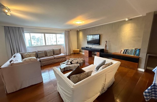 Nestled in Itaim Bibi, São Paulo, surrounded by the best bars and restaurants , supermarket and shopping malls within a walking distance this charming 250sqm apartment with a park view boasts 3 bedrooms—one with a king bed, one with a queen bed (that can be arranged as two twins), and one with two twin beds—plus a small extra suite for a housekeeper. The master suite's bathroom is a luxurious retreat, featuring two showers for added comfort. With a total of 4 bathrooms equipped with showers and bidets, a large office, and 3 living rooms, guests will have plenty of space to relax and freshen up in the past and the most safe neighborhood in São Paulo.