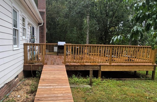 This 3-bedroom house in Wake Forest is perfect for your escape. With 1 queen bed and 2 full beds, guests will find a delightful and peaceful retreat. Enjoy the convenience of amenities like AC, iron, and heating. The 2 bathrooms come equipped with a hair dryer, 1 Full bath and 1 master bath with separate shower and garden tub. Enjoy viewing the deer from the front porch or rear deck as they often frequent the property.