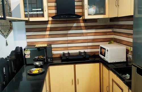 Our home has 2 bedrooms with attached bathrooms and a guest bedroom. In total we have three bedrooms and a capacity of 7 guests at a time. We have a open kitchen with all necessary utencils and basic appliances.