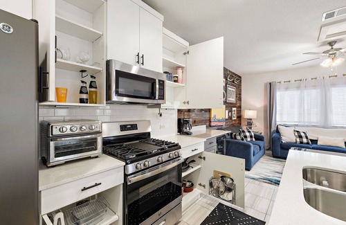 Welcome to your Georgetown townhome—modern, easygoing, and minutes from the Historic Square and Blue Hole Park, with quick toll road access. The open living/dining area flows into a cook-ready kitchen (gas range, microwave, toaster oven, full cookware). Pull up to the island’s three stools or gather at the dining table for six. Mix a drink at the built-in bar with mini-fridge, then head outside: xeriscaped front and back yards make lounging simple, and the built-in gas grill is ready for easy dinners. Sleep comes easy in three queen bedrooms (sleeps six) with a primary ensuite, a shared tub/shower bath, and a downstairs powder room. You’ll have fast Wi-Fi, central A/C, and an in-home washer/dryer. Parking is straightforward: a single-car garage and driveway, plus additional parking down the street. Guests also enjoy access to the neighborhood amenity center with a pool and gym. Bonus: shelves of books throughout for cozy mornings and wind-down nights.