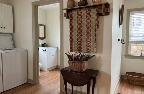 You can make your own breakfast in a fully stocked kitchen (4 saddle bar stools) with combo coffee & Keurig pot, toaster, etc. Also, on the first floor is dining room, den/living room with smart TV, utility room & access to the covered front & back porch. Enjoy the sounds of rain (on the tin roof), geese & ducks on the pond, songbirds and the twilight sounds of frogs & “lightning” bugs/fireflies.