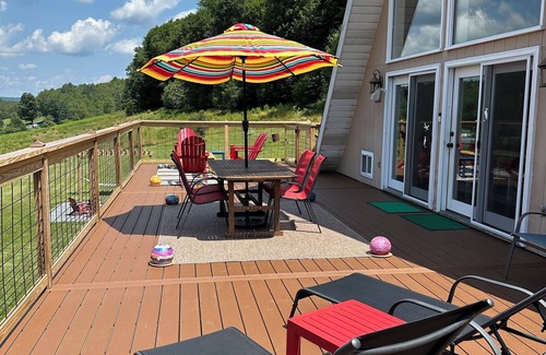 Charming and cozy getaway on 14 private acres in the Pennsylvania Wilds with all the comforts of home. 3 large bedrooms and 2.5 modern baths, a large family room with the most comfortable couch in the world, a dining area with views of a private pond and forested mountains, and a wraparound deck. Idyllic setting with woodlands and a private pond stocked with largemouth bass, excellent opportunities for wildlife viewing, and stunning night skies, plus modern amenities. Fully stocked modern kitchen, large capacity washer and dryer, internet with WiFi, satellite TV, ecologically sensitive heat and a/c. The house has a Ring doorbell in case you have any trouble getting in and have no cell reception—just ring the doorbell and we can help! The A-frame is close to Cherry Springs, Sinnemahoning, Ole Bull, Prouty Place, and Lyman Run State Parks and Susquehannock State Forest. It is also near ATV and snowmobile trails, and convenient to the UPMC Cole Hospital and the amenities of Coudersport.