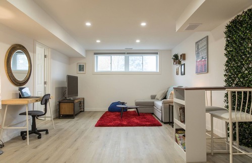 Please keep in mind to access the space there is a small flight of stairs down leading down to the unit. To accommodate extra guests, the couch in the living room is a pullout couch that can sleep 2 kids comfortably or one adult (you can squeeze two adults if comfortable but it is a bit tight).
