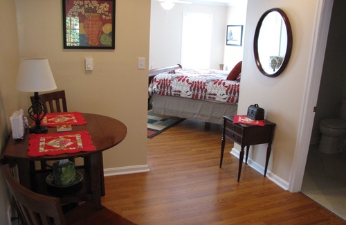 Private entrance. 2nd floor one bedroom efficiency, with queen sleigh bed, two easy chairs. Bathroom with shower. Fully equipped eat-in kitchen. All linens and towels supplied. TV and WiFi. Enjoy your vacation in this lovely apartment in downtown Gettysburg. With ample parking in the back, once you arrive you will not need to drive while you are here! You can walk easily to shops and restaurants, and areas of the Battlefield and many historic sights.