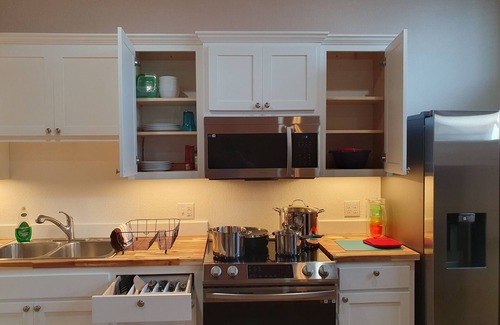 We renovated and furnished this about 800 sqf lovely home in a former comercial building to make it a year round comfortable and enjoyable place for our guests. The kitchen is fully appointed with all appliances including stove, oven, coffee maker, refridgerator, dishwasher and microwave.