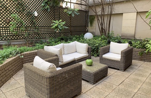 The 690 Sq Ft terrace, in addition to the many trees and plants, has a dining area for 4 guests, and a sitting area with sofa and armchairs.
